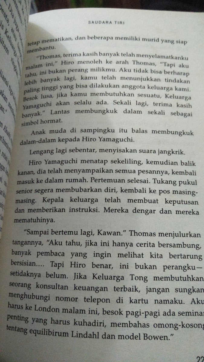 Tapi setidaknya Kawan dalam situasi apapun petarung sejati akan terus memilih kehormatan hidupnya. Format PDF novel Bedebah di Ujung Tanduk ini dapat Anda download secara mudah melalui link di akhir artikel. Download Novel Negeri Para Bedebah PDF - Tere Liye Thomas atau sebutan lain Tommi adalah tokoh utama dalam cerita ini.